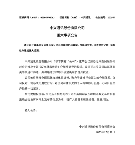 12 月 11 日,发布《首要事项公告》。中兴通信股份有限公司董事会已细察近期新闻媒体针对公司触及好意思国《反国外陷落法》合规性拜访的报谈。中兴通信正与好意思国功令部就相关事项进行交流,并将通过法律等技巧坚决爱戴本人权利。
