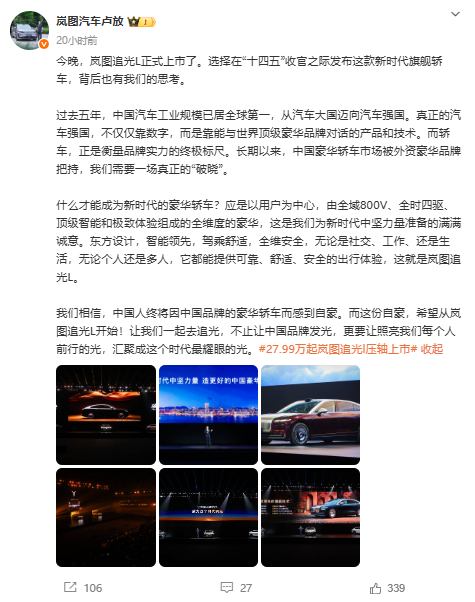 岚图汽车科技股份有限公司董事长、党委通知卢放发文称,往时五年,中国汽车工业范围已居全球第一,从汽车大国迈向汽车强国。确凿的汽车强国,不单是靠数字,而是靠能与天下顶级豪华品牌对话的产物和技巧。卢放涌现,轿车恰是权衡品牌实力的终极标尺。耐久以来,中国豪华轿车市场被外资豪华品牌摆布,咱们需要一场确凿的“破晓”,中国东谈主终将因中国品牌的豪华轿车而感到自尊。